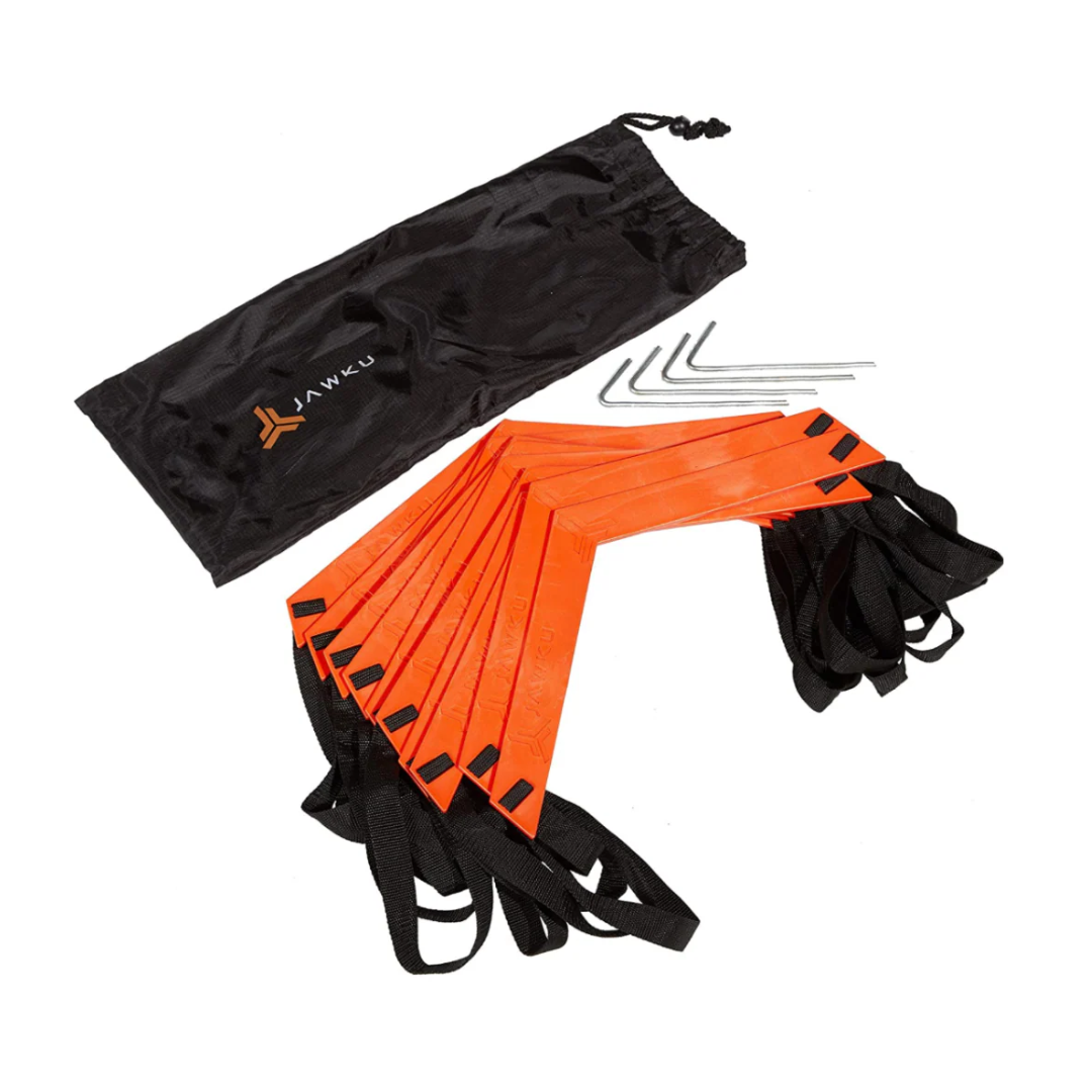 Train like the pros with this innovative new ladder to quickly improve your acceleration, lateral speed and change of direction while enhancing balance, rhythm and body control. The JAWKU Speed & Agility Ladder is constructed with Low Density Polyethylene, is flexible and adjustable, which offers excellent performance for footwork training with tangle-free straps. Secure it in place with rust-resistant metal pegs. The extra-long ladder has 15 rungs, 0.25 inch thickness, 21 feet In Length, and is 17.25 inches wide. Great to use as a warmup routine before training, which will noticeably improve your performance and skills. The unique pointed rung shape makes it more efficient to go through the ladder faster without hitting the rungs. The ultra-durable rungs are strong enough for cleats and any other footwear you throw at it.